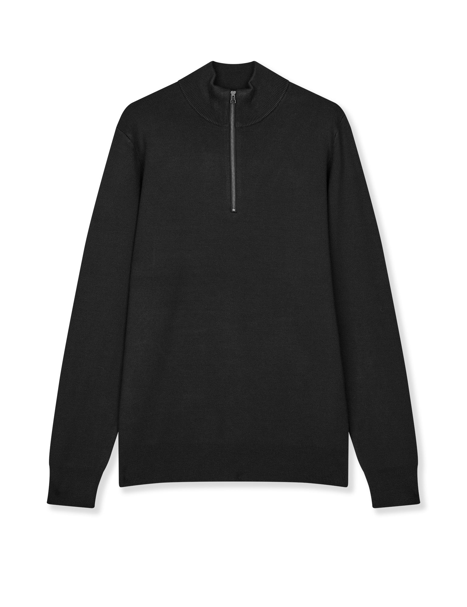Komplett glatter und schlichter Strickpullover mit einem hohen Kragen, einem Reißverschluss in der Brustmitte und mit gestrickten Rippbündchen.