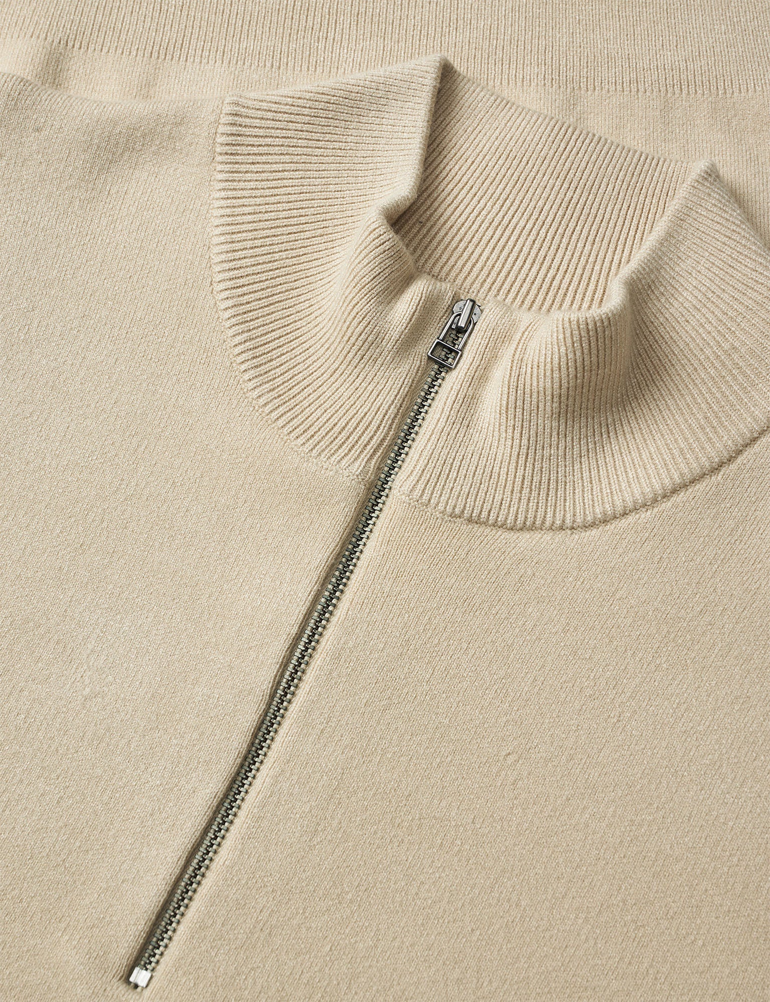 Komplett glatter und schlichter Strickpullover mit einem hohen Kragen, einem Reißverschluss in der Brustmitte und mit gestrickten Rippbündchen.