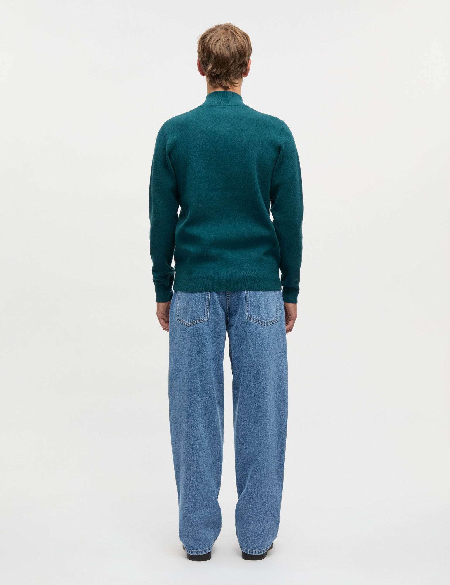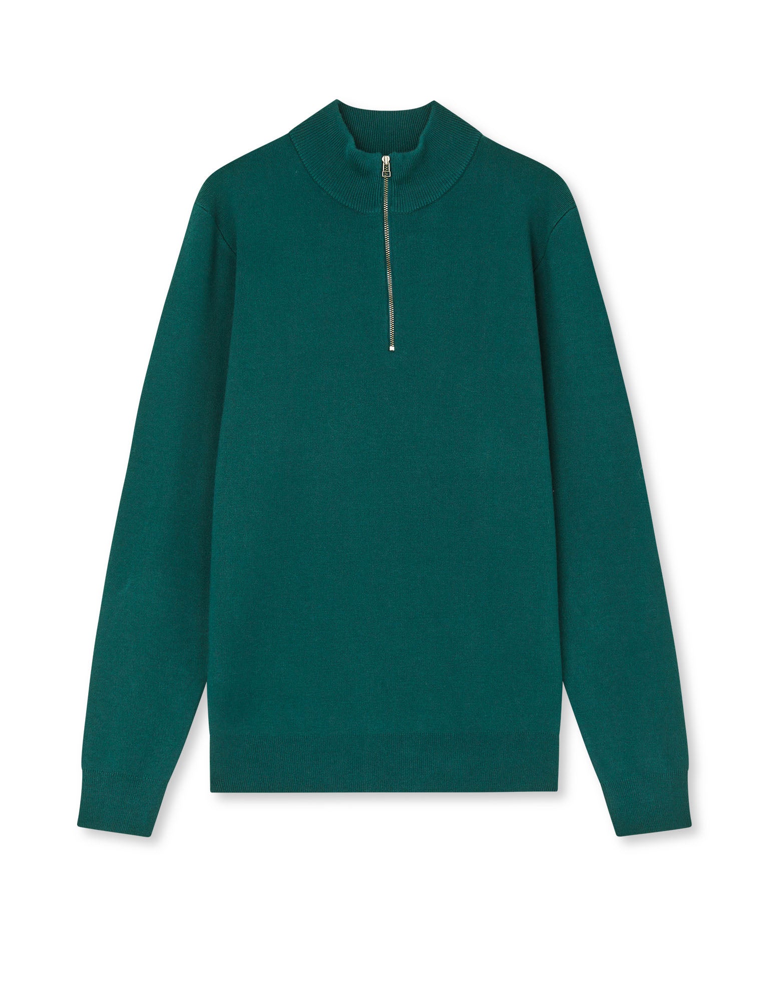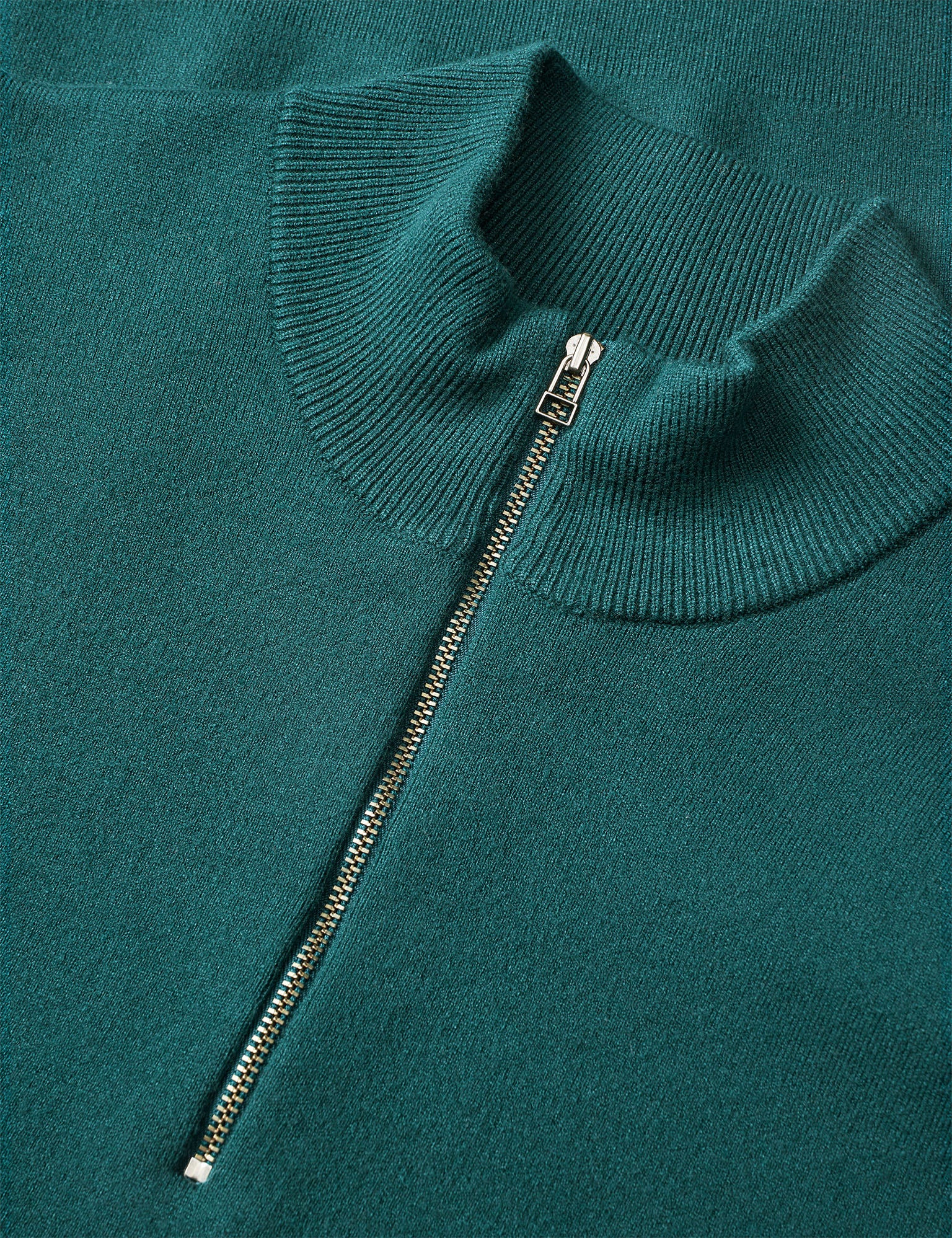 Komplett glatter und schlichter Strickpullover mit einem hohen Kragen, einem Reißverschluss in der Brustmitte und mit gestrickten Rippbündchen.