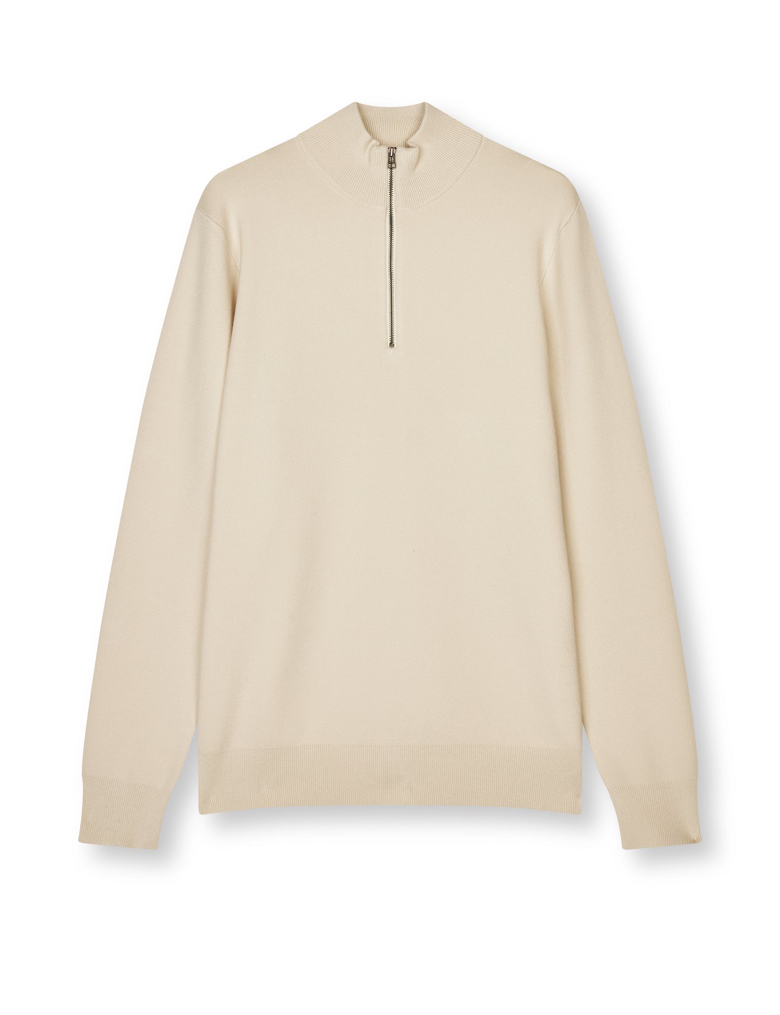 Komplett glatter und schlichter Strickpullover mit einem hohen Kragen, einem Reißverschluss in der Brustmitte und mit gestrickten Rippbündchen.