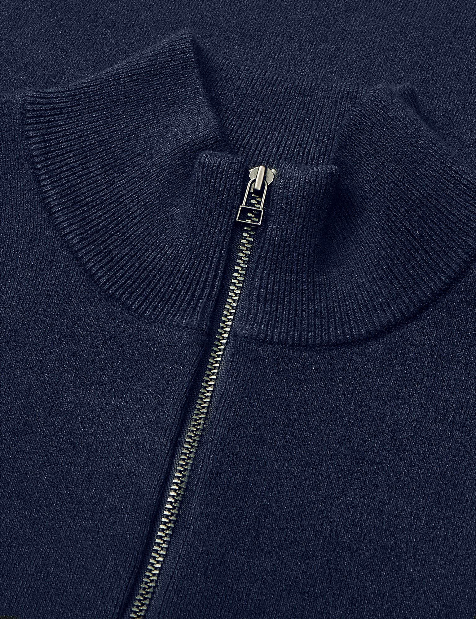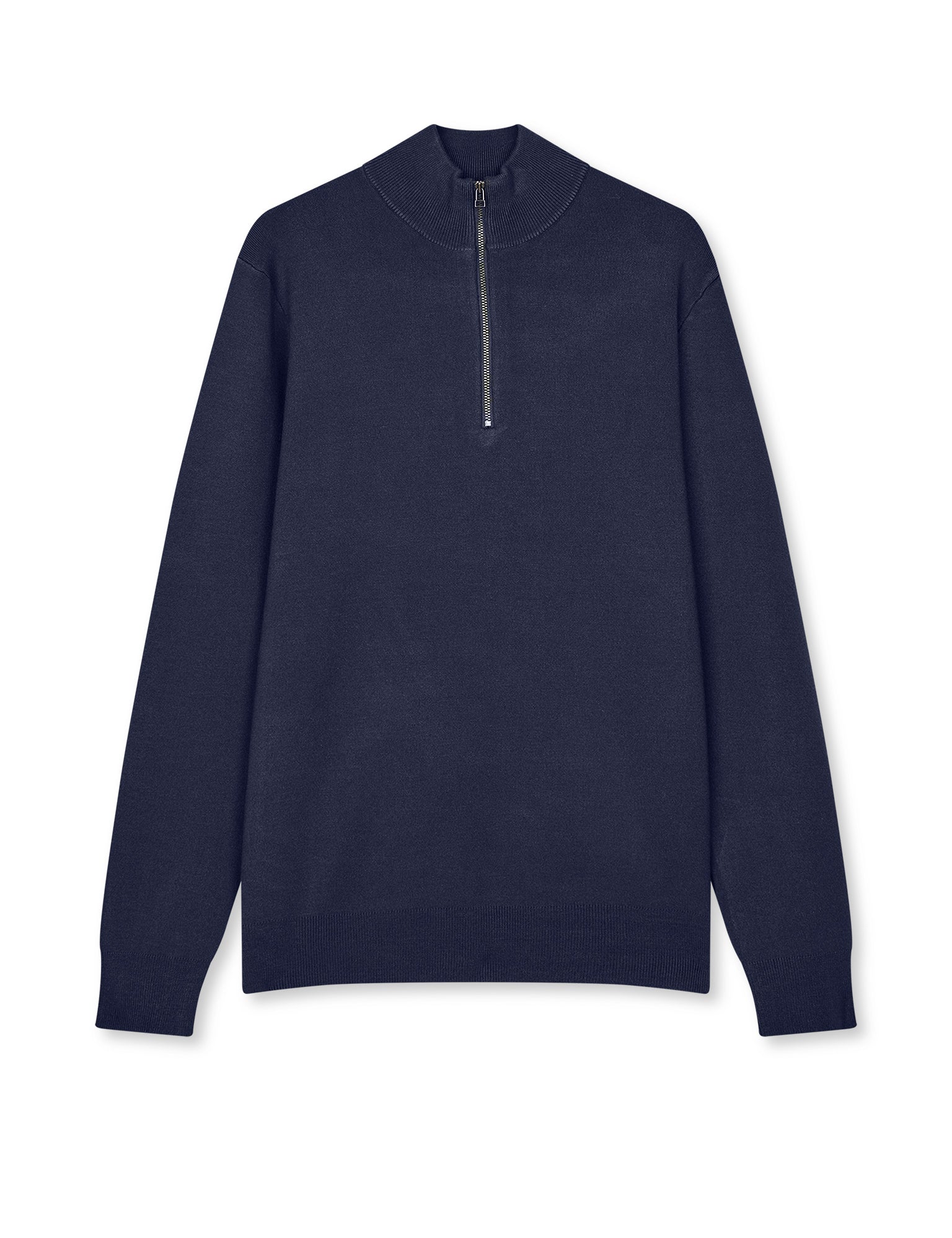 Komplett glatter und schlichter Strickpullover mit einem hohen Kragen, einem Reißverschluss in der Brustmitte und mit gestrickten Rippbündchen.