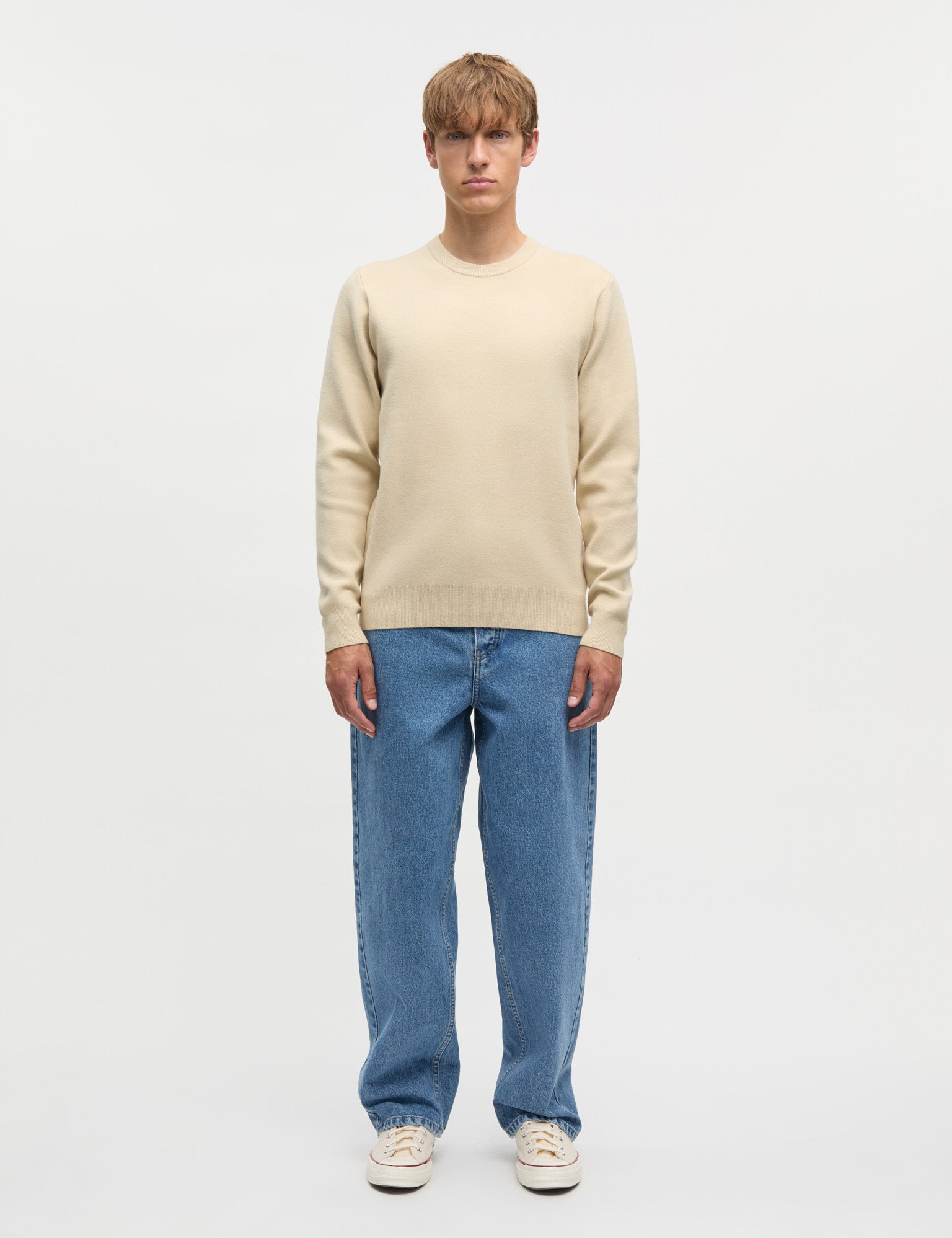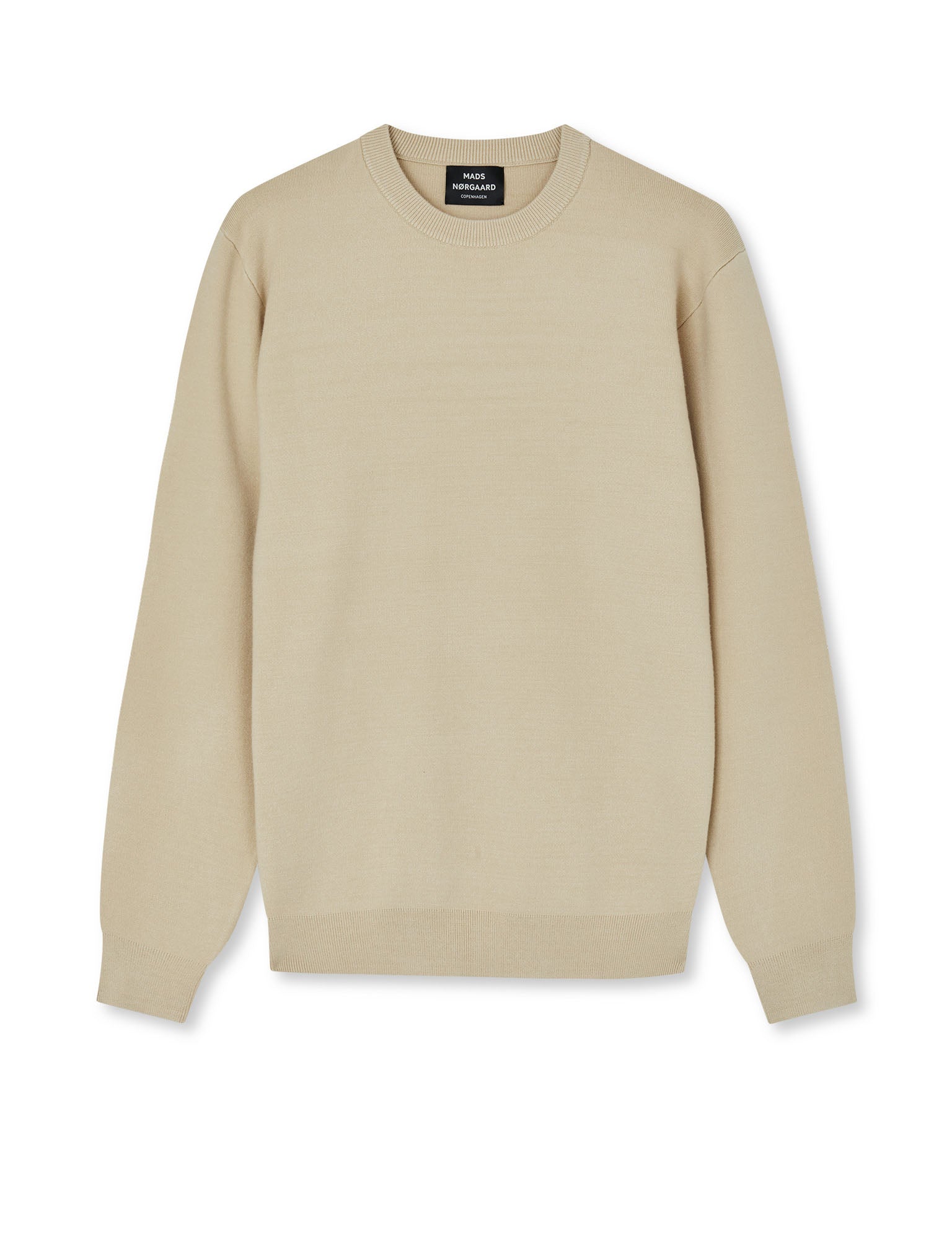 Komplett glatter und schlichter Strickpullover mit einem Rundhalsausschnitt und gestrickten Rippbündchen.