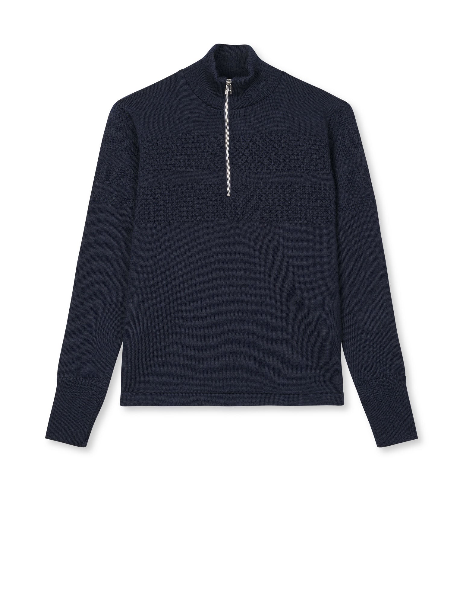 Schwerer Matrosenpullover mit einem Reißverschluss in der Brustmitte, einem hohen Kragen und langen Ärmeln mit Umschlagbündchen.