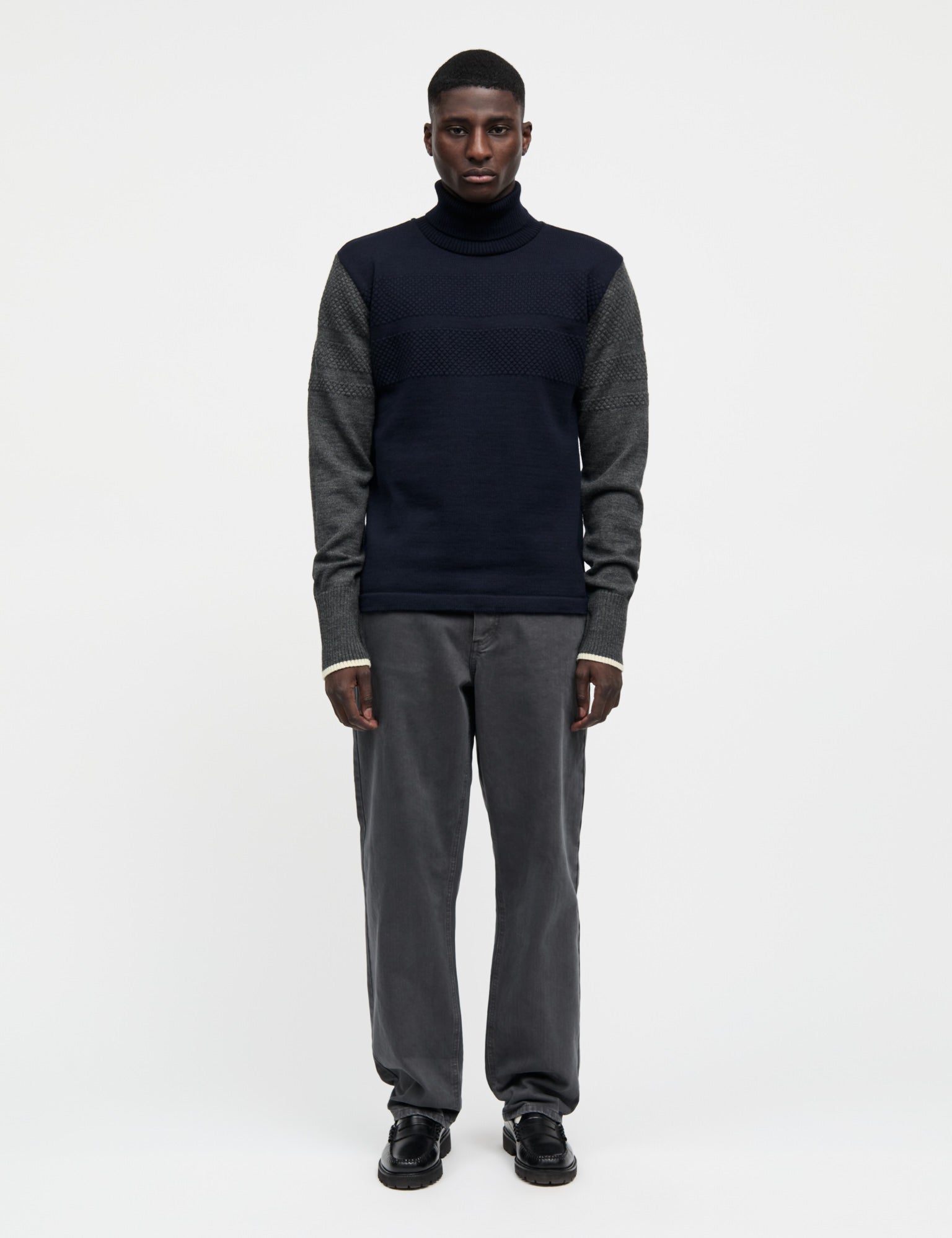 Unser Klassiker, der Strickpullover Wool Klemens Knit, ist aus 100 % Wolle gefertigt. Er ist dicht gestrickt, schwer und wirklich warm. Die Bündchen sind gerippt, der Kragen ist hoch, die Passform ist eng und der Stil ist seemännisch.