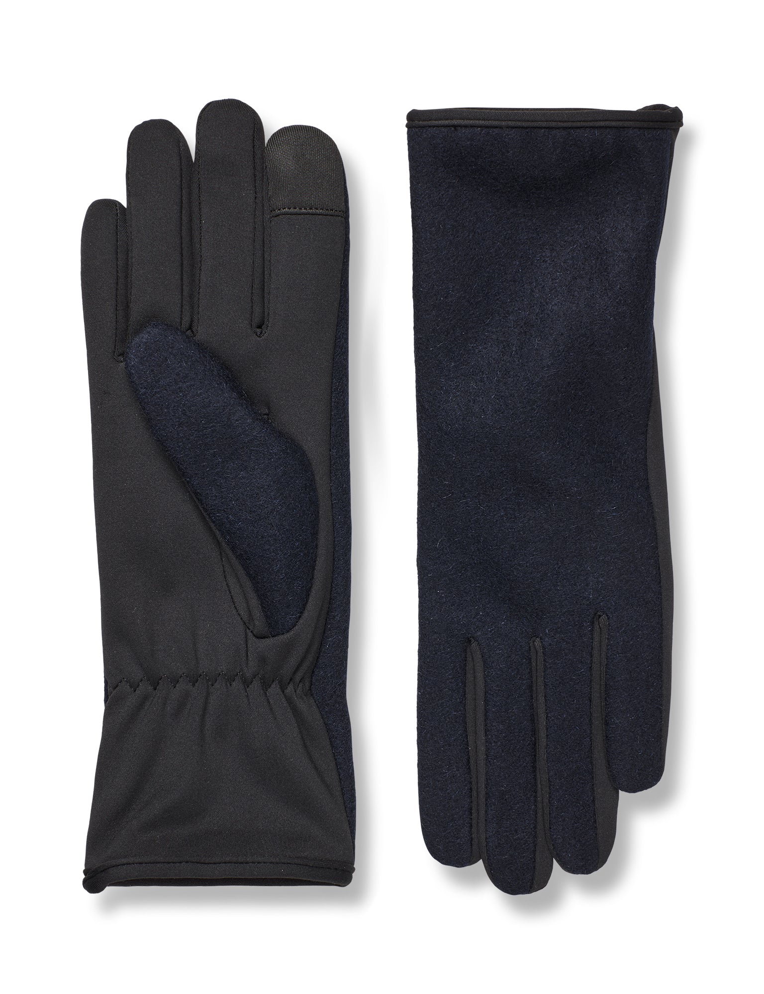 Handschuhe mit gefilzter Wolle an den Handrücken und weichem, flexiblem Stoff in den Handflächen. Darüber hinaus ist ein Finger mit Touchscreen-Funktion ausgestattet.
