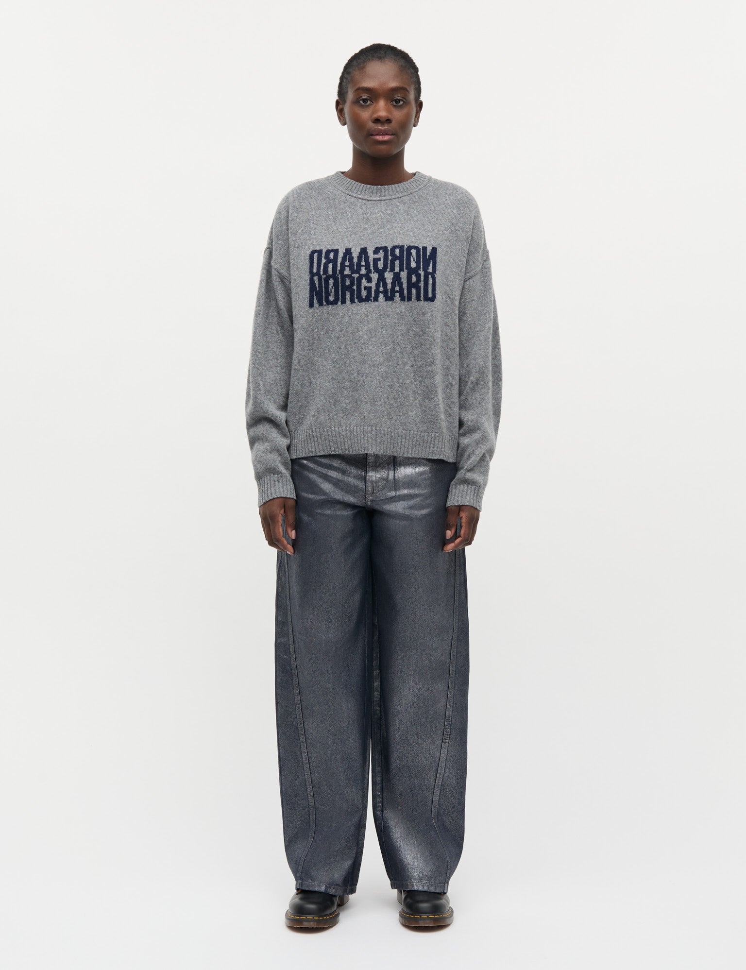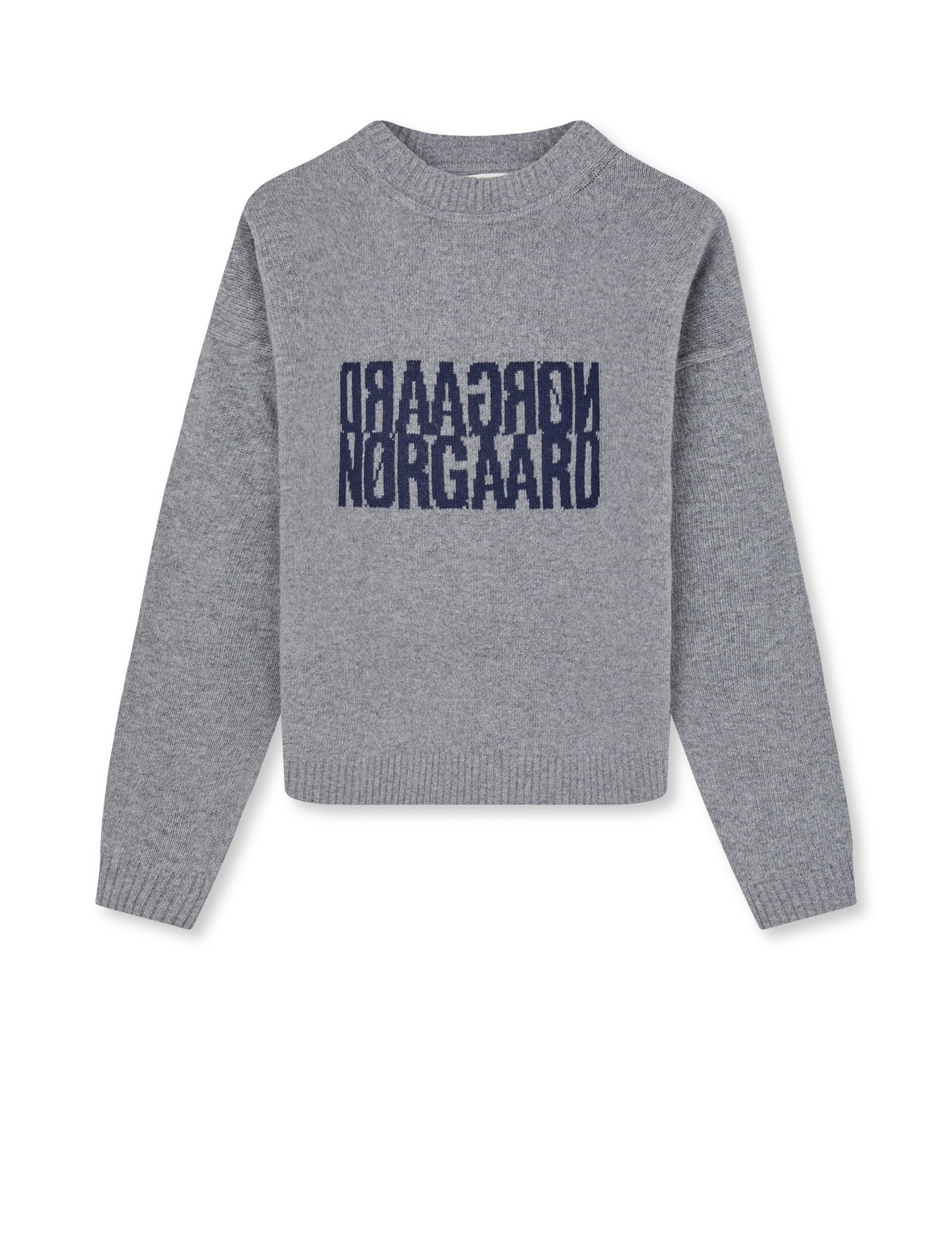 Lockerer Strickpullover mit Dropped-Shoulders, langen Ärmeln, breiten Rippbündchen und einem teilweise gespiegelten Logo auf der Brust.